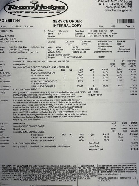 Inspection completed, oil and filter changed, cabin air filter replaced, wipers replaced, replaced thermostat and performed cooling system flush, replaced ESIM, replaced parking brake cable, total reconditioning $1,402.
