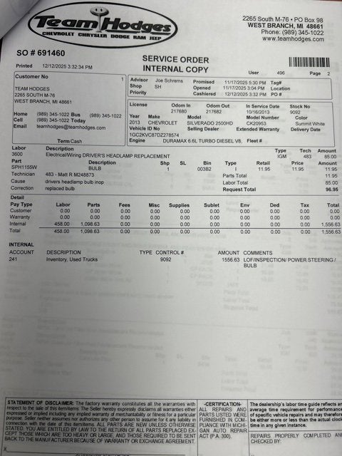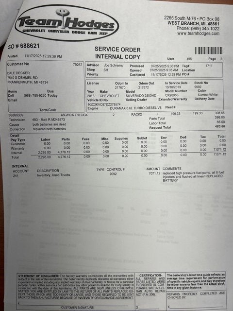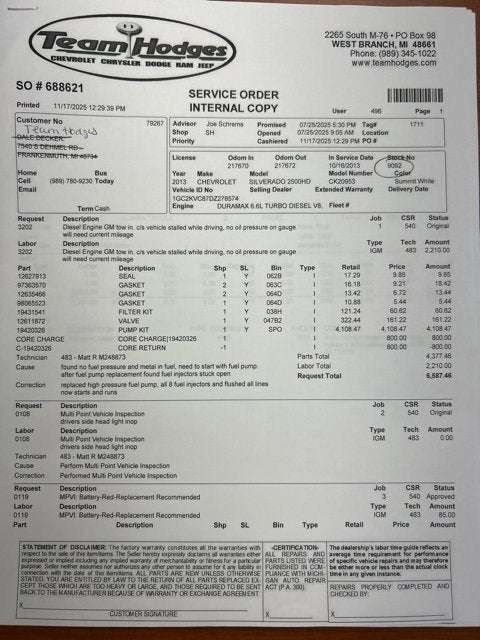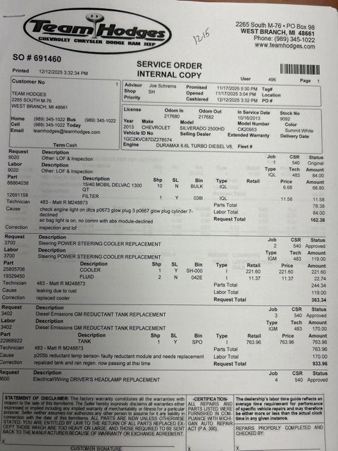 Inspection completed, replaced high pressure fuel pump, all 8 injectors and flushed all lines, replaced both batteries, oil and filter changed, replaced power steering cooler, replaced reductant tank, replaced drivers headlight bulb, $8,628.