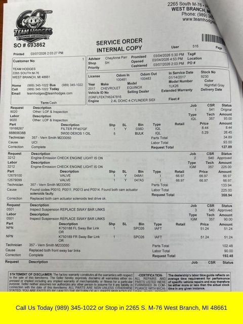 Nightfall Gray Metallic 2017 Chevrolet Equinox LT AWD 6-Speed Automatic with Overdrive 2.4L 4-Cylinder SIDI DOHC VVT AWD.Call TODAY to make sure this vehicle is still available!! Recent Arrival! Odometer is 16762 miles below market average! 20/28 City/Highway MPGAwards:* JD Power Dependability Study * 2017 KBB.com 10 Most Awarded BrandsTeam Hodges West Branch It's worth the drive!!Reviews:* Backseat has plenty of space and slides/reclines for added comfort; optional V6 engine provides quick acceleration; interior stays quiet at speed; rides smoothly on rough roads. Source: Edmunds