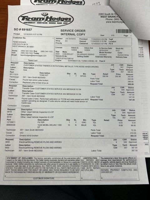 Inspection completed, replaced rear pinion seal, oil and filter changed, total reconditioning $1,656.