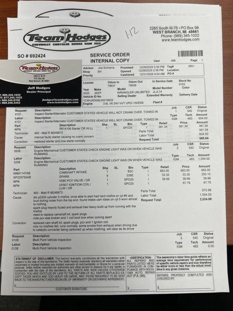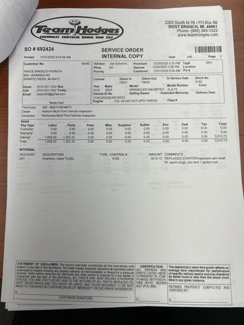 Inspection completed, replaced camshaft pcv, 1 coil and all spark plugs, oil and filter changed, total reconditioning $3,425.
