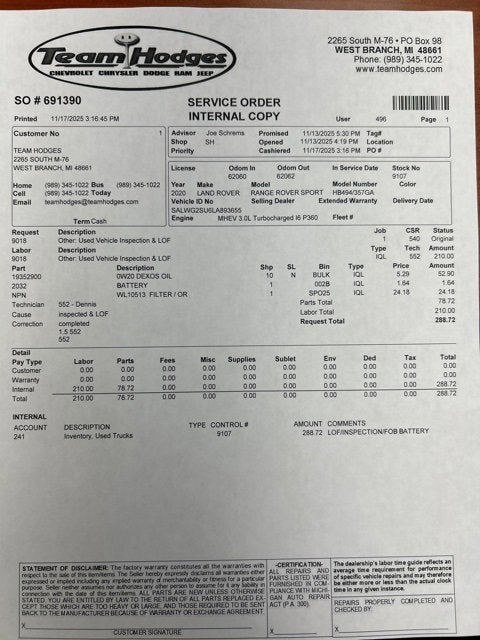 Inspection completed, oil and filter changed, total reconditioning cost $439.