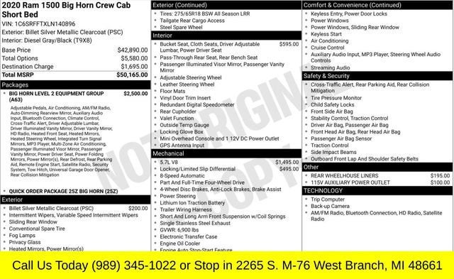 Inspection completed, oil and filter changed, replaced cabin air filter, total reconditioning $467.Billet Silver Metallic Clearcoat 2020 Ram 1500 Big Horn/Lone Star 4WD 8-Speed Automatic HEMI 5.7L V8 Multi Displacement VVT**ONE OWNER**, **NON SMOKER**, **Bluetooth®**, **REMOTE START**, **LOCAL TRADE IN**115V Auxiliary Power Outlet, 115V Auxiliary Rear Power Outlet, 2 USB Full Function/Charge Only Media Hub, 2nd Row In Floor Storage Bins, 400W Inverter, Air Conditioning ATC w/Dual Zone Control, Auto-Dimming Rear-View Mirror, Big Horn Badge, Big Horn IP Badge, Big Horn Level 2 Equipment Group, Black Premium Power Mirrors, Class IV Receiver Hitch, Dampened Tailgate, Foam Bottle Insert (Door Trim Panel), Glove Box Lamp, Heated Front Seats, Heated Steering Wheel, ParkSense Front/Rear Park Assist w/Stop, Power 4-Way Driver Lumbar Adjust, Power 8-Way Driver Seat, Power Adjustable Pedals, Quick Order Package 25Z Big Horn, Radio: Uconnect 4 w/8.4 Display, Rear Dome w/On/Off Switch Lamp, Rear Power Sliding Window, Rear Window Defroster, Security Alarm, SiriusXM Satellite Radio, Sun Visors w/Illuminated Vanity Mirrors, Universal Garage Door Opener.Call TODAY to make sure this vehicle is still available!! Recent Arrival!Team Hodges West Branch It's worth the drive!!