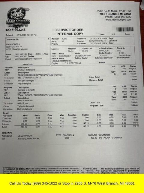 Inspection completed, oil and filter changed, replaced wiper blades, cabin, and engine air filters, repaired damage to the tailgate, total reconditioning $1,345.