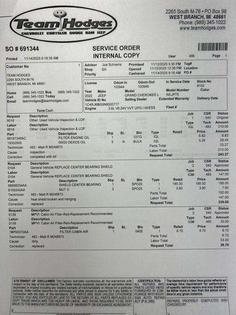 Inspection completed, oil and filter changed, replaced center bearing shield, replaced cabin air filter, total reconditioning $773.