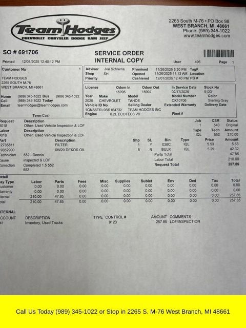 Inspection completed, oil and filter changed, total reconditioning $404.